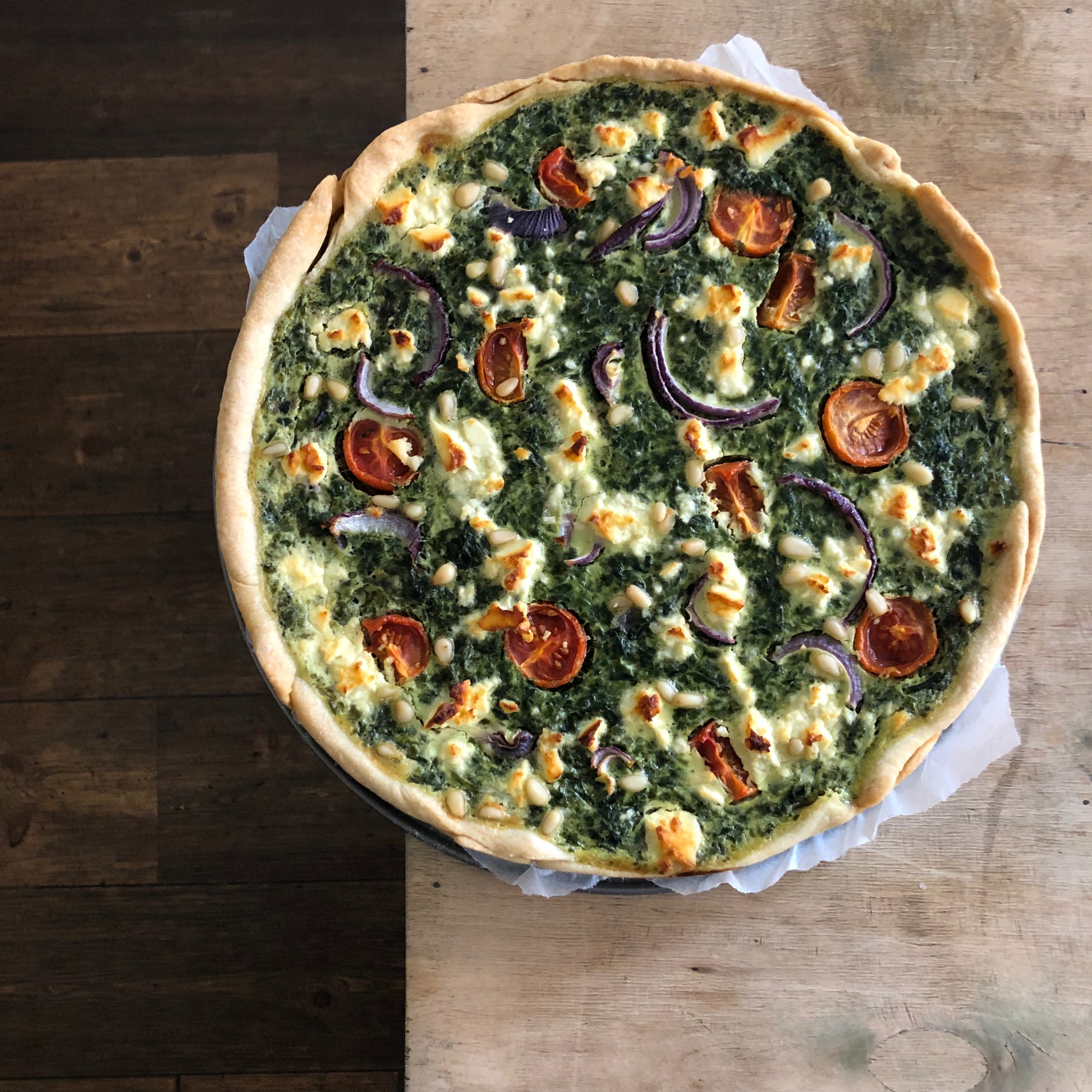 Quiche mit Spinat, Hirtenkäse und Tomate